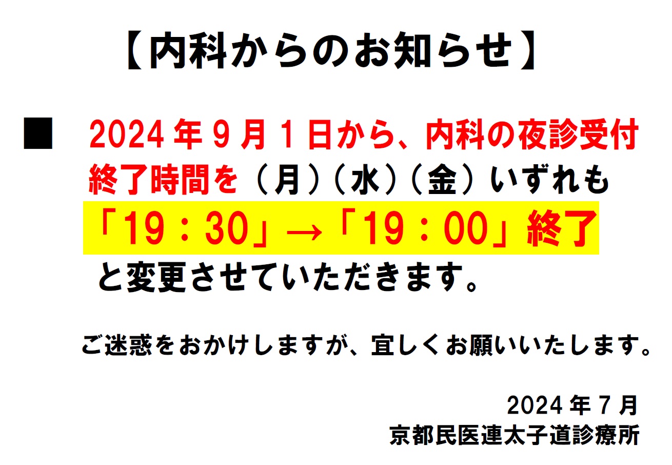ホーム 当院について お知らせ 内科の夜診受付時間の変更のお知らせ(2024年9月1日~) お知らせ 内科の夜診受付時間の変更のお知らせ(2024年9月1日~) 2024年07月16日 ※2024年9月1日から、内科の夜診受付終了時間を(月)(水)(金)いずれも 「19:30」→「19:00」と変更させていただきます。 ご迷惑をお掛けし大変申し訳ございませんが、ご理解の程よろしくお願い致します。 詳細は下記の画面をクリックしてご覧ください。