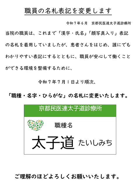 当院の職員は、これまで「漢字・氏名」「顔写真入り」表記の名札を着用していましたが、患者さんをはじめ、誰にでもわかりやすい表記にするとともに、職員が安心して働くことができる環境を整備するために、「職種・名字・ひらがな」の名札に変更いたします。(令和7年7月1日より順次)