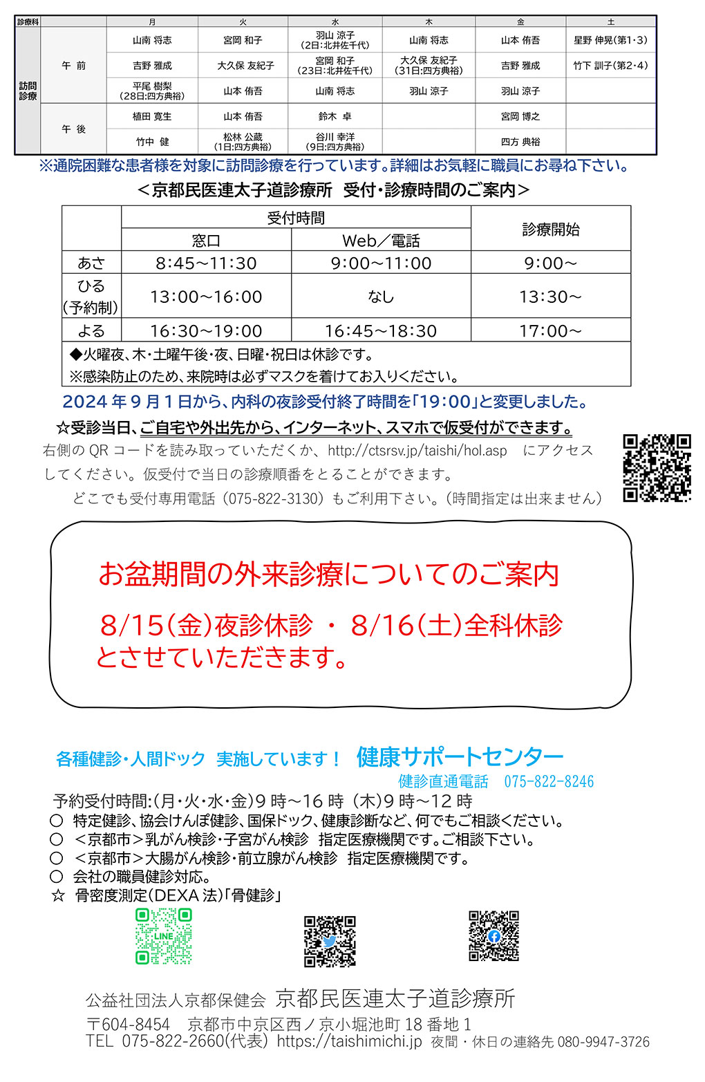 8/15(金)夜診休診・8/16(土)全科休診とさせていただきます。