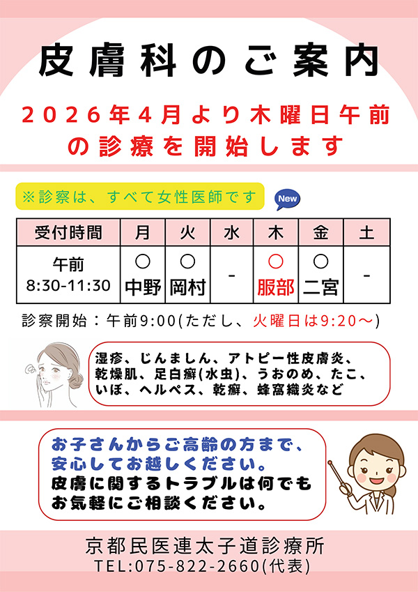 皮膚科の診療体制について、2026年4月より下記のとおり変更となります。